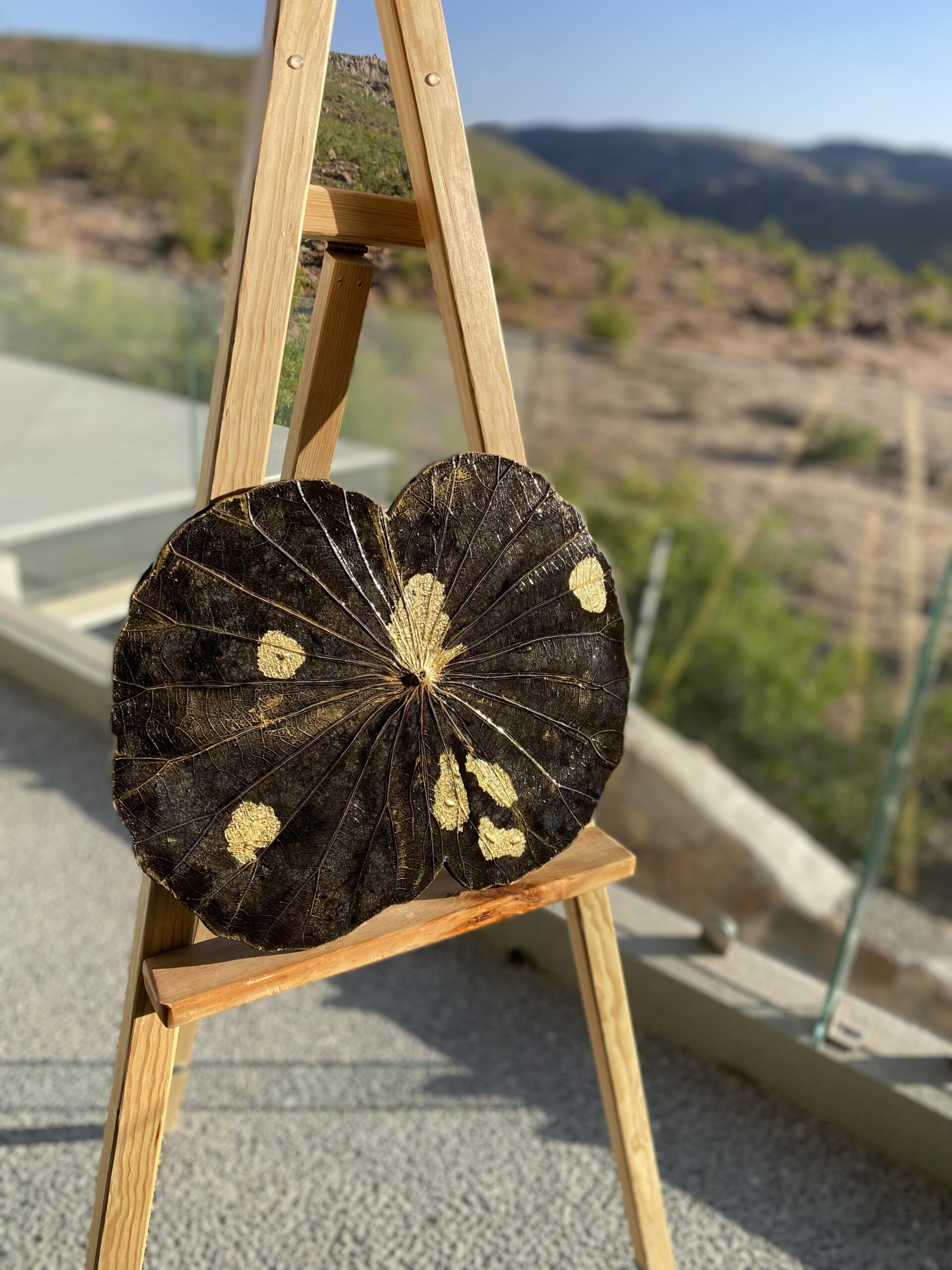 Understated yet powerful, this dark-toned lotus leaf art shimmers with golden touches. It embodies elegance and strength, inviting quiet contemplation and a sense of grounded luxury.
