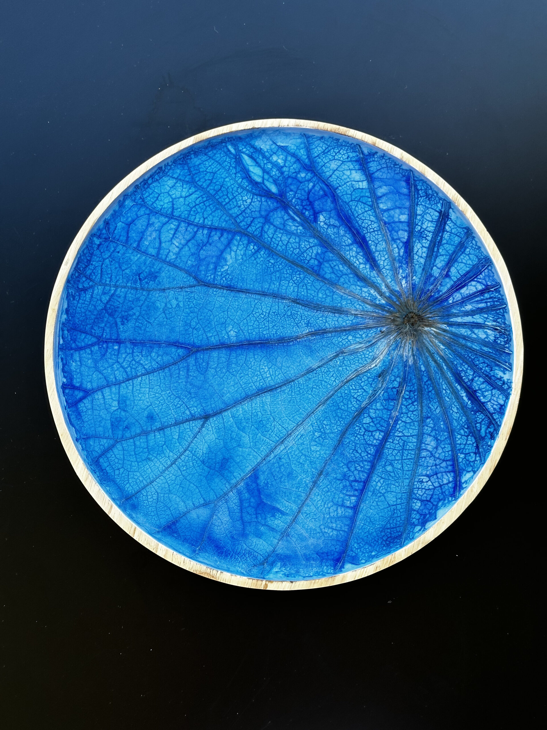 A striking round tray featuring a vivid blue lotus leaf, its natural veins radiating like a burst of energy. Surrounded by a golden rim, it captures elegance, calm, and a deep connection to nature.