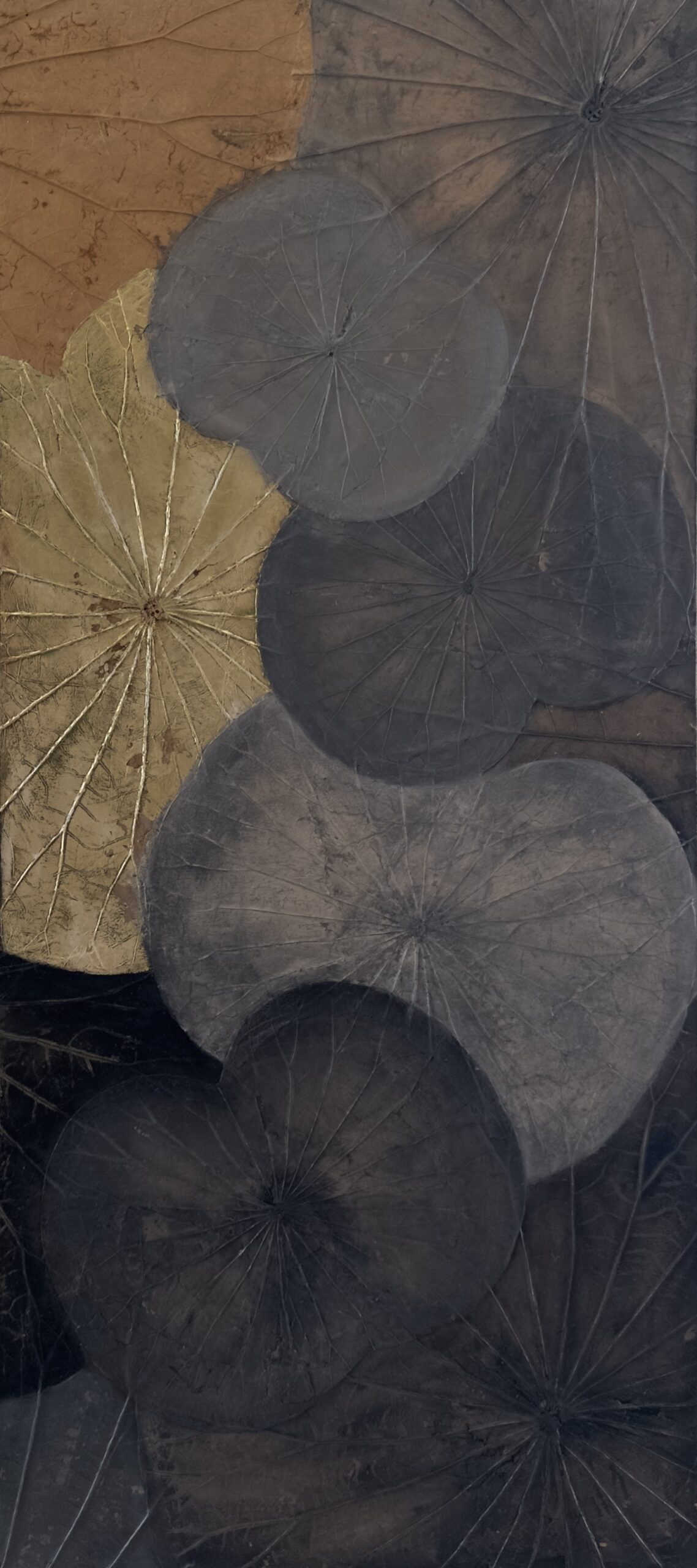 Three panels full of soft grey, smoke, and sand tones. Each lotus leaf feels like a breath of silence. Gold accents shine through like bright moments in life—times of light and clarity. This artwork is simple and calm, reminding us to pause, reflect, and see the beauty in quiet moments.