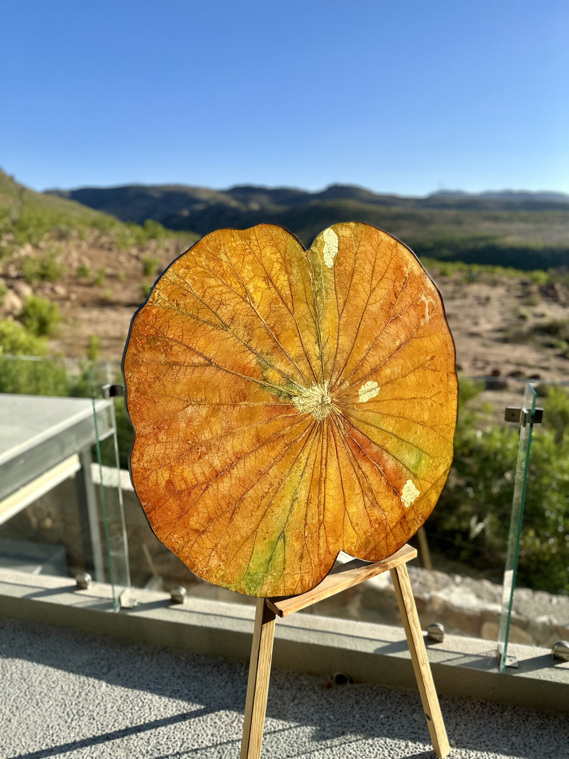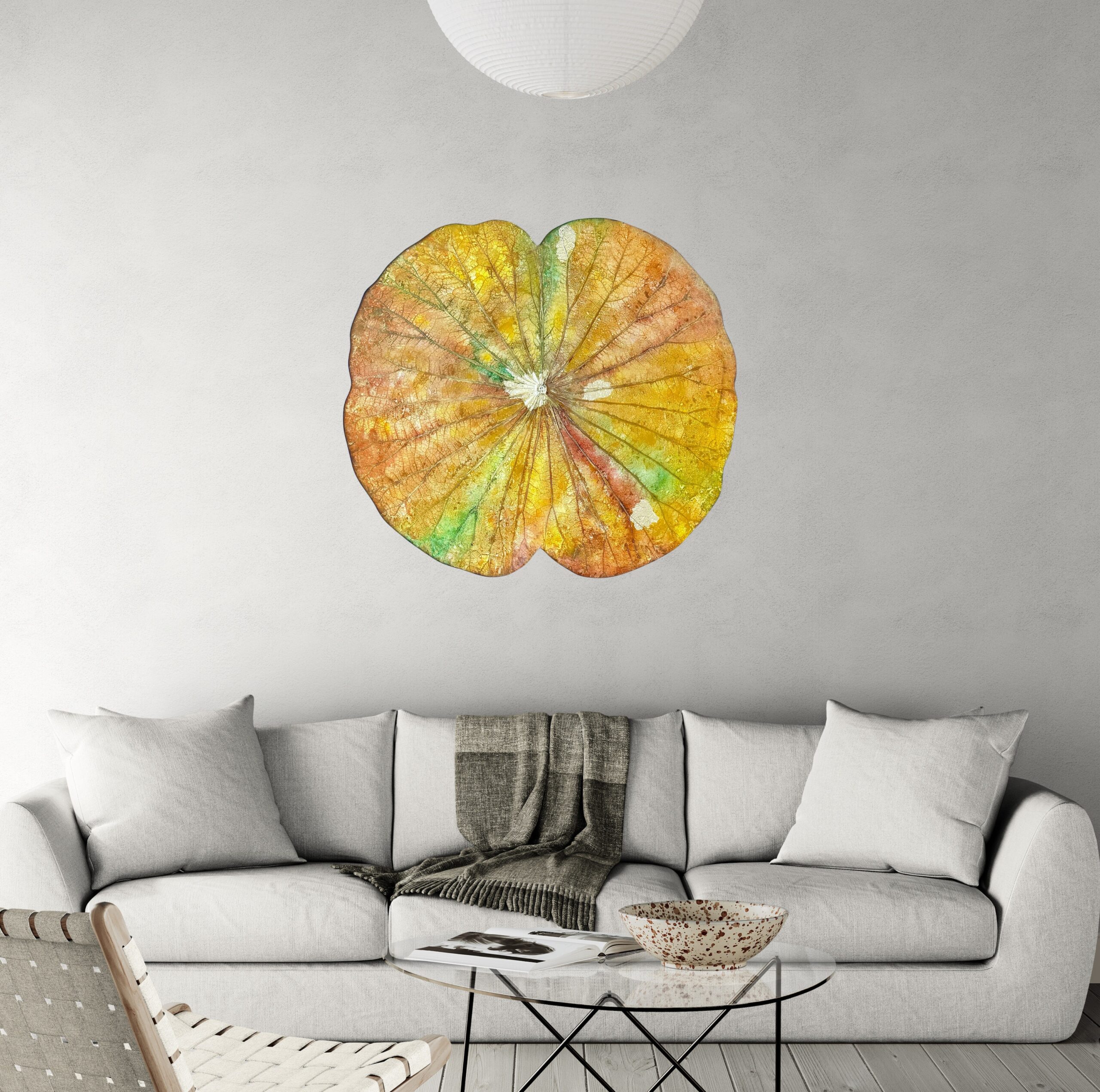 A leaf that carries the colors of earth, sun and life. Yellows melt into greens, soft reds into warm browns—finished with golden touches like gentle sunlight. This art brings warmth and natural abundance to any room. A celebration of grounded beauty.