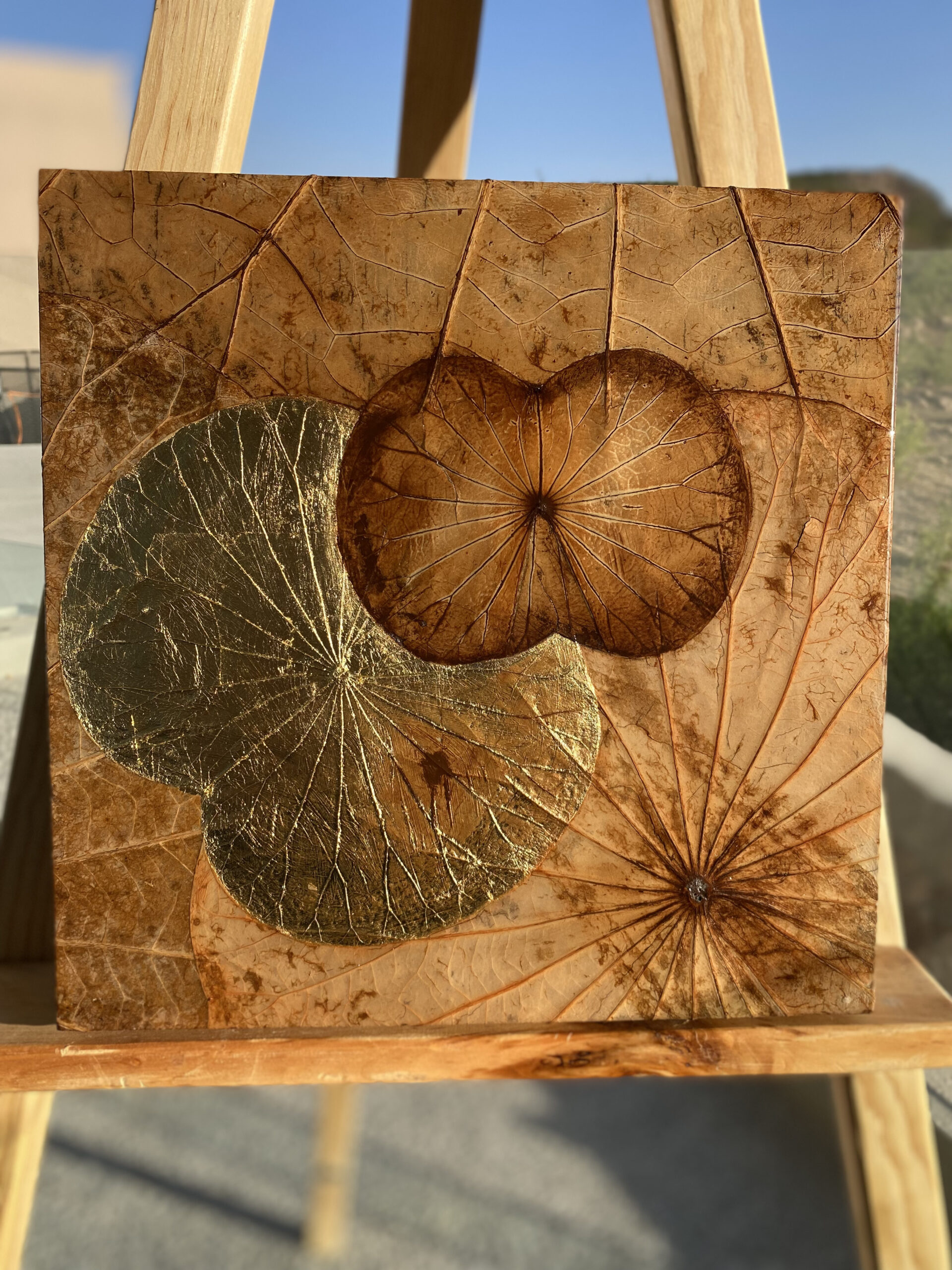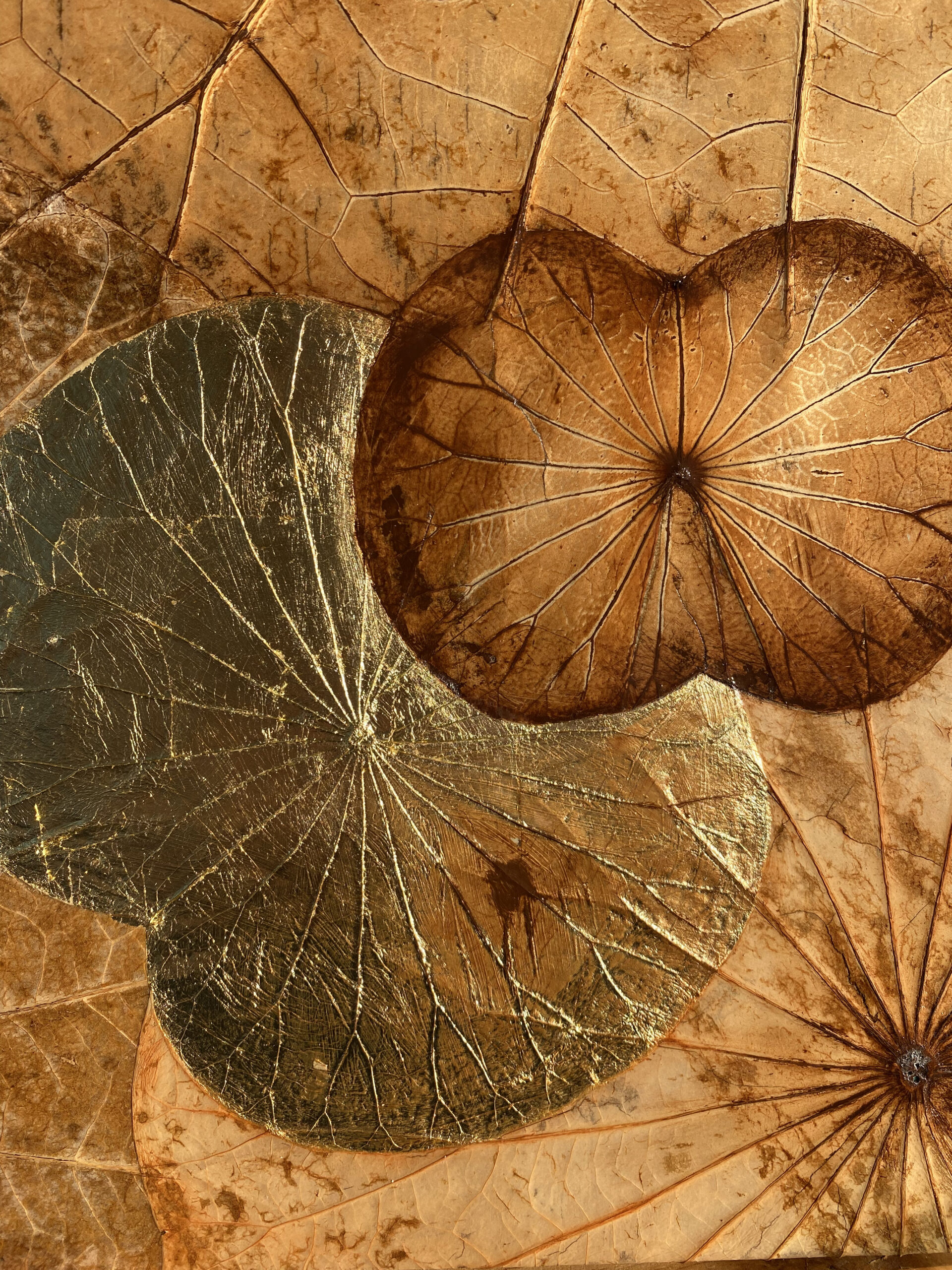Each unique piece features real lotus leaves adorned with hand-applied 24K gold leaf.