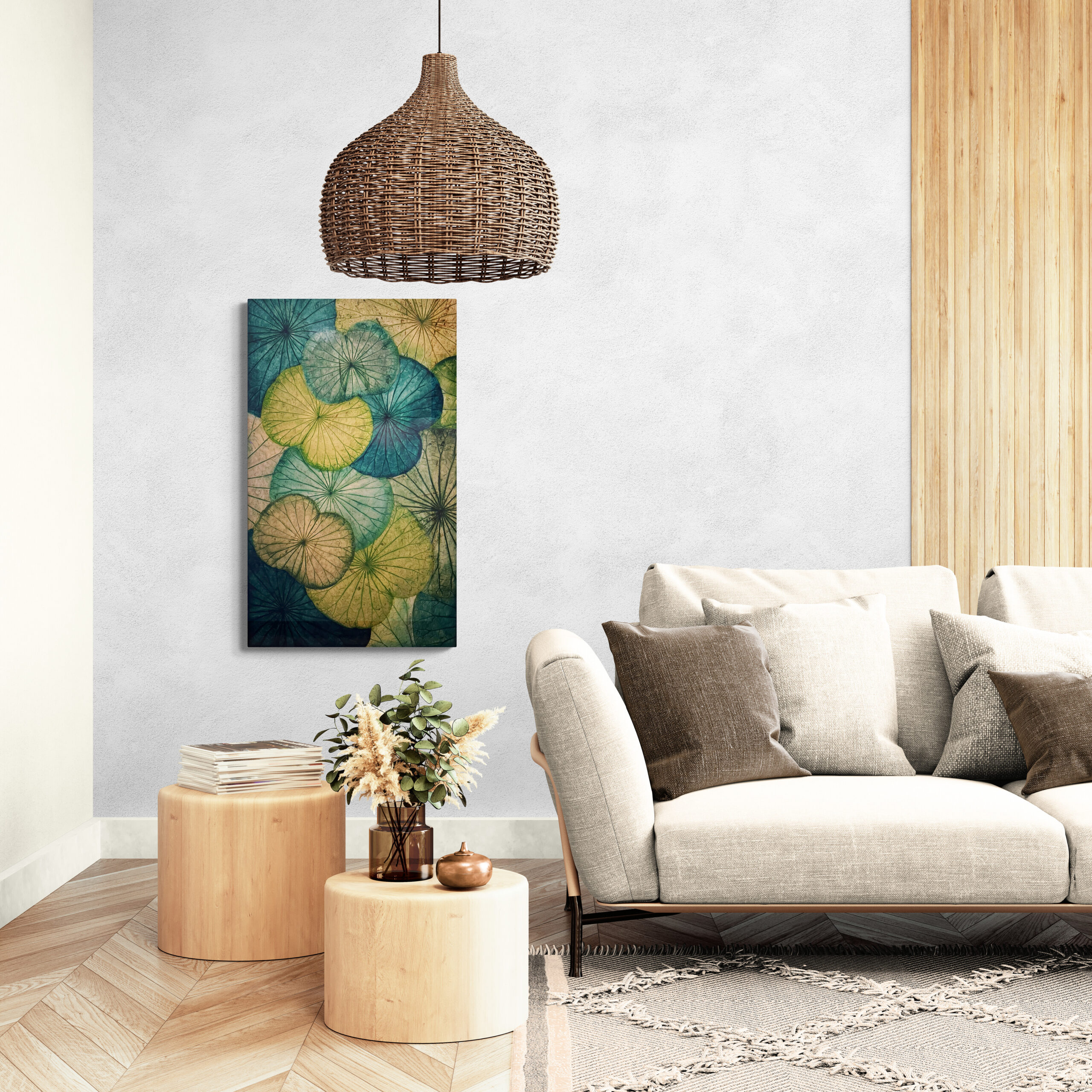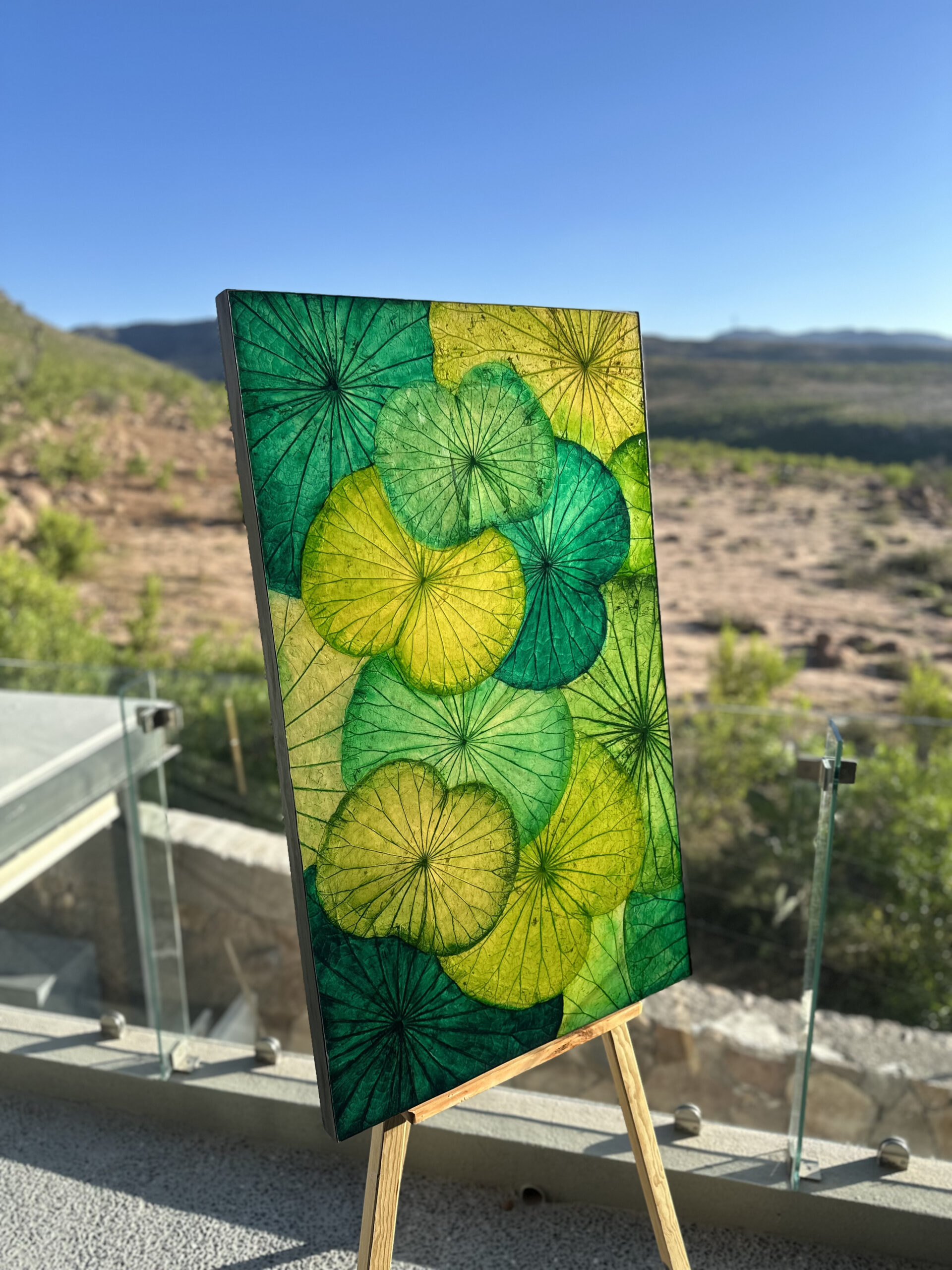 Bright green lotus leaves overlap and dance across the canvas. This piece is full of movement and joy. It feels like walking barefoot in a peaceful garden—fresh, playful, and alive. The colors bring balance and a light, joyful energy to any space.