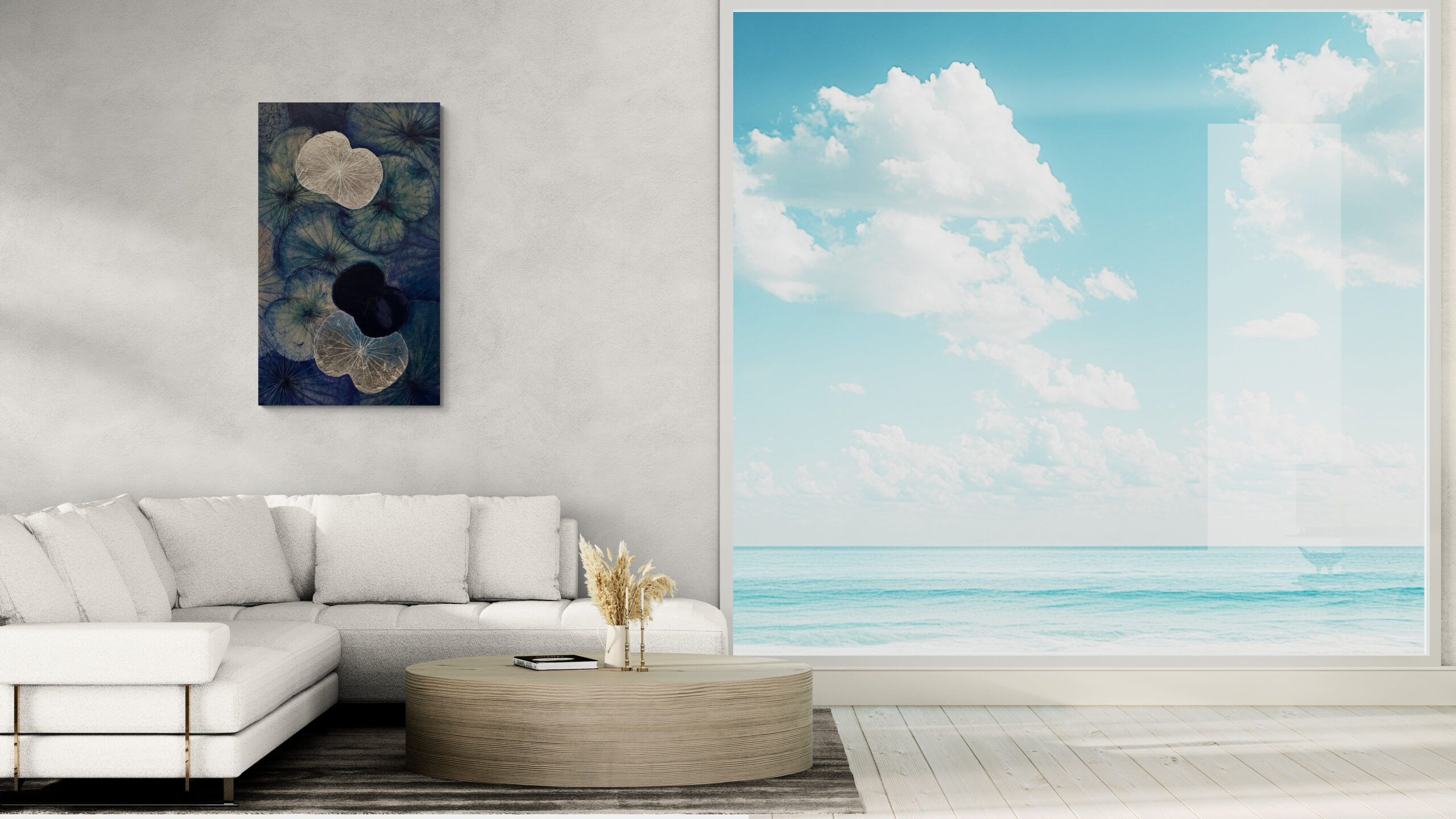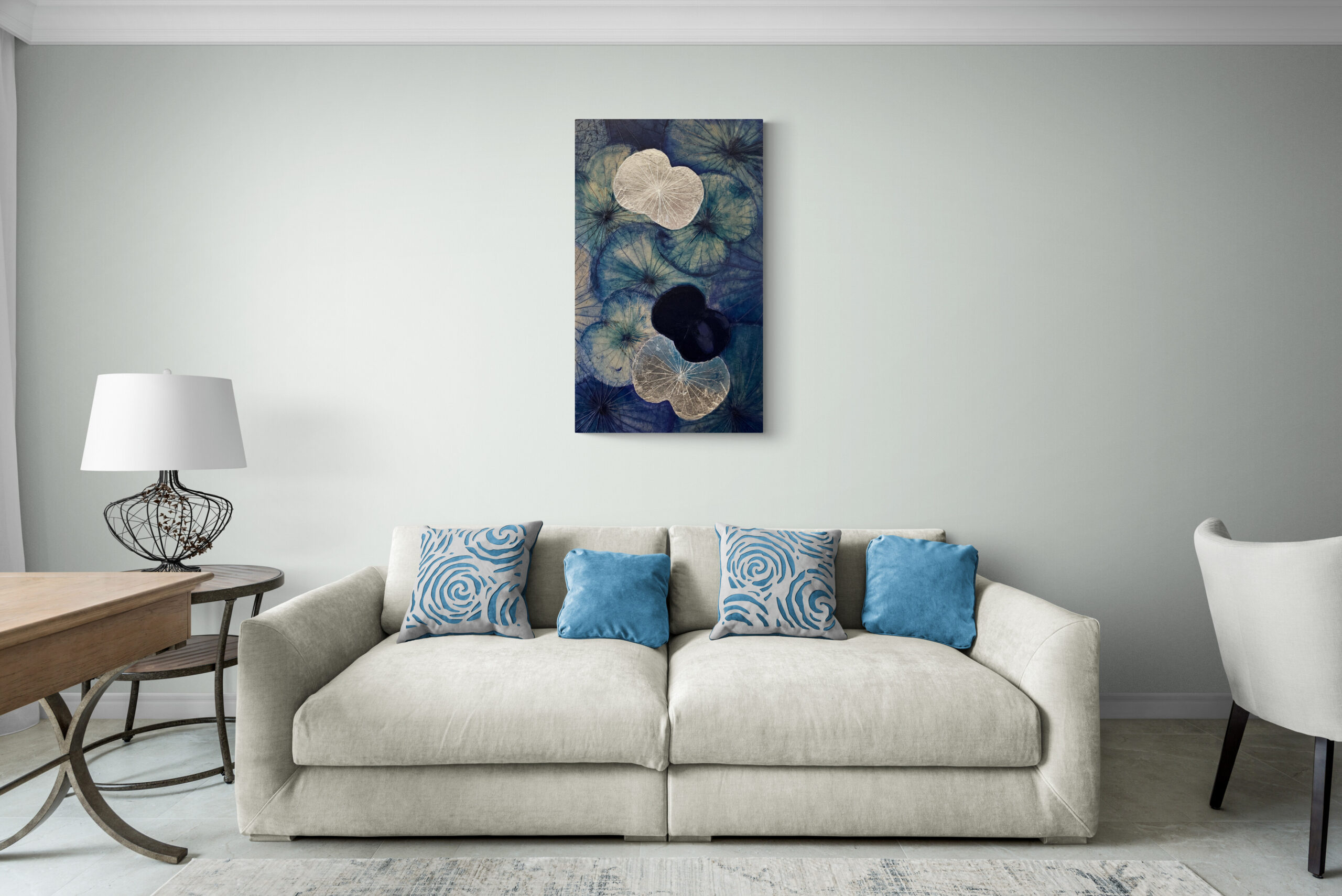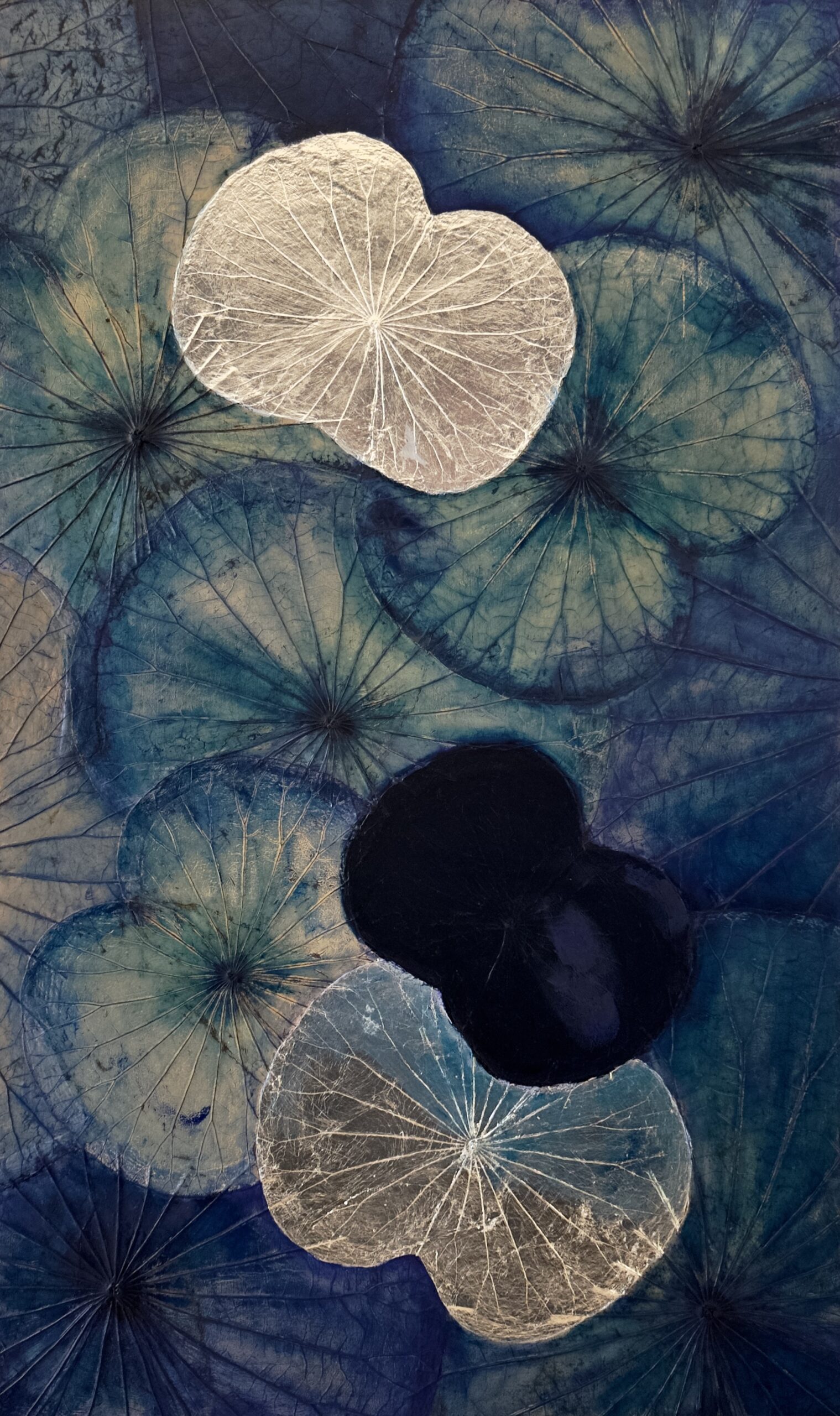 This striking artwork is inspired by the deep, calming power of the ocean at night. Real lotus leaves, arranged in flowing layers, are hand-painted in rich shades of deep blue and midnight tones – like waves moving in silence. The silver leaf accents reflect the moonlight on the water’s surface, capturing a moment of stillness, reflection and inner peace.