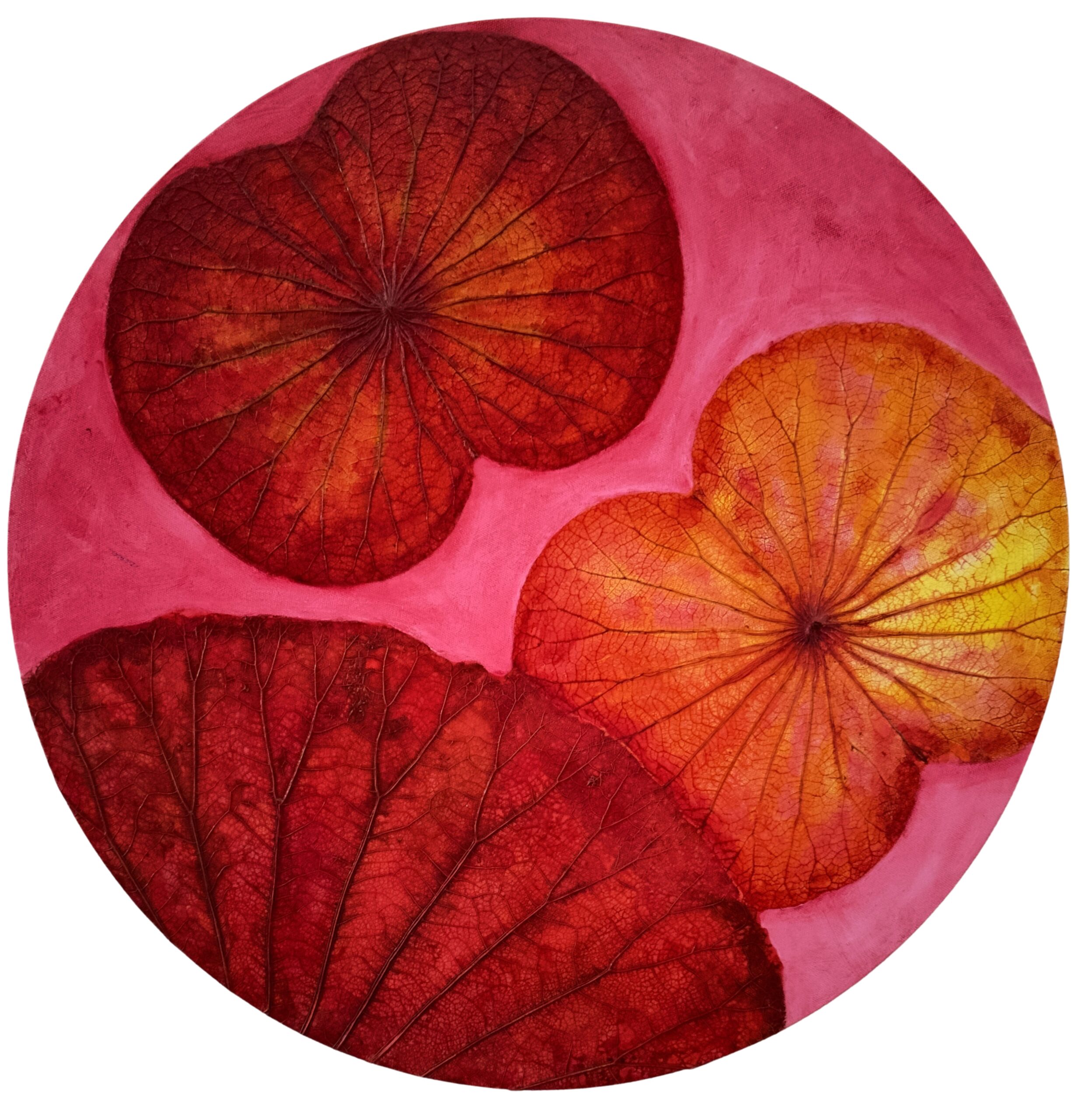 Bold colors of red, orange, and Mexican pink fill this artwork with joy and power. The lotus leaves seem to glow with energy. It feels like sunlight, celebration, and the happiness of being alive. A perfect piece for bringing warmth and bright spirit into your home.